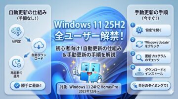 Windows 11 25H2の自動更新と手動アップデート方法を初心者向けに解説 「またWindows アップデート?」「勝手に更新されるのは怖い…」と不安に感じていませんか? Microsoftは Windows 11 バージョン 25H2(2025 Update) の提供を開始しました。現在 Windows 11 24H2 をお使いの方なら、今回の更新はびっくりするほどスムーズに完了する設計に… -