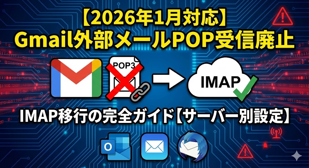 この記事は、Gmail「他のアカウントのメールを確認(POP)」機能終了に対して「IMAP移行」を選択した方向けの詳細な設定ガイドです。「そもそもどの対策を選ぶべきか」「自分が影響を受けるか確認したい」という方は、まず以下の記事をご覧ください: