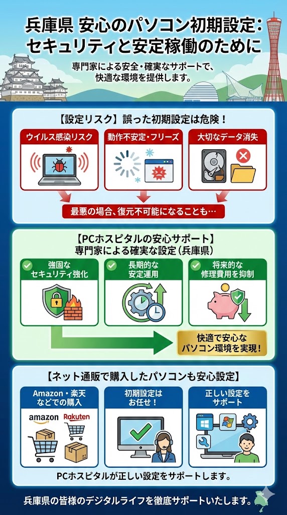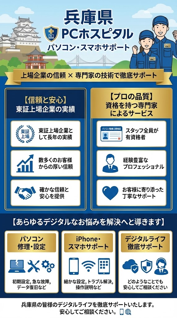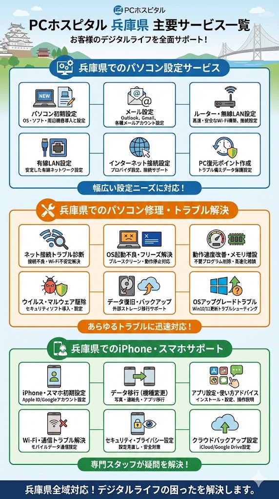 兵庫県にお住まいの皆さまへ:パソコン設定・修理・iPhone・スマホサポートはPCホスピタルで安心
