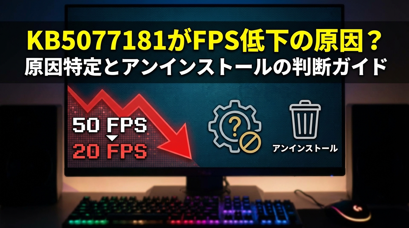 本記事では、KB5077181によるFPS低下の切り分けとアンインストール判断について、確認手順、注意点、再インストールを防ぎながら次の更新を待つ考え方まで整理して解説します。