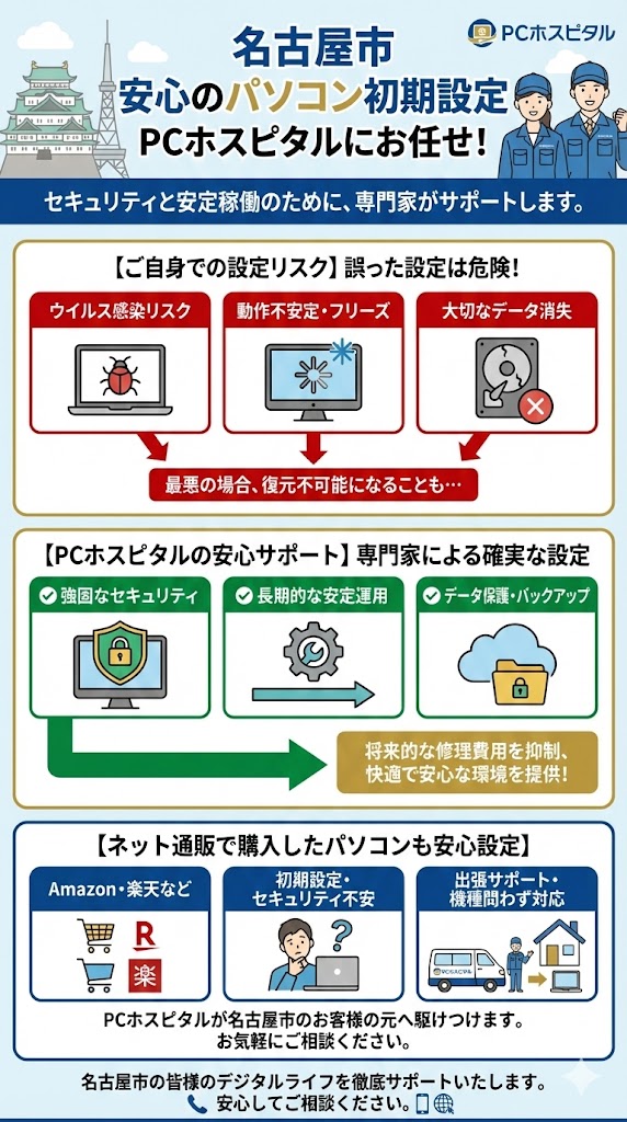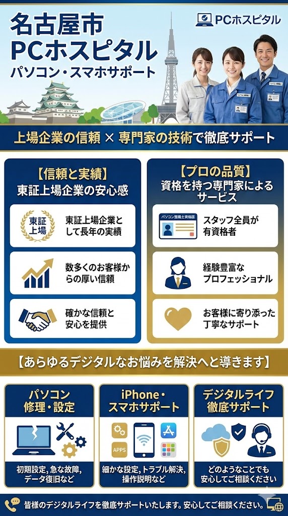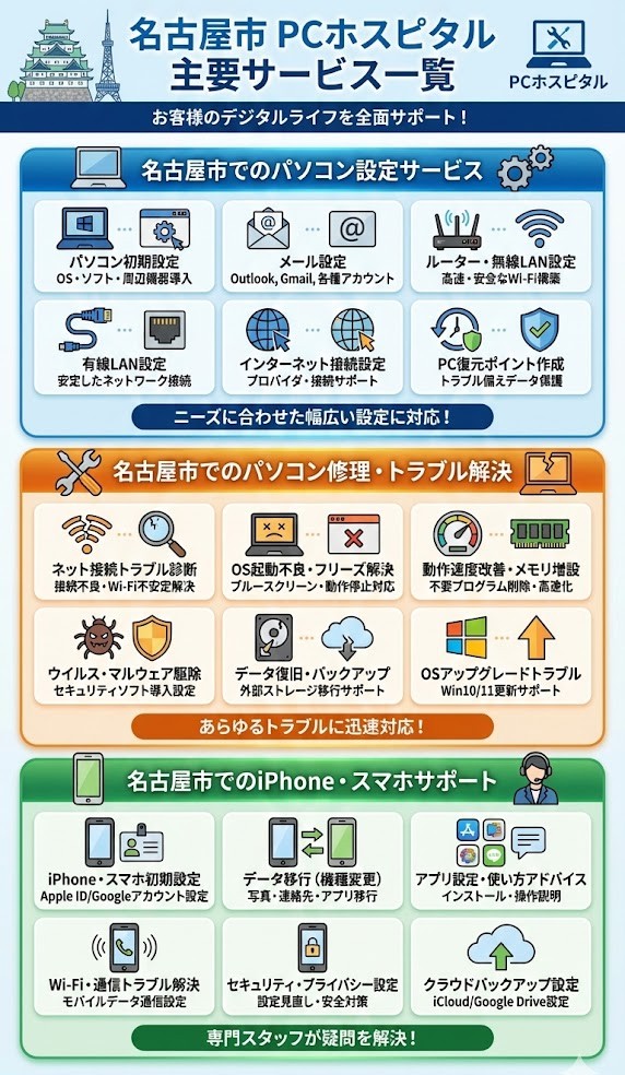名古屋市にお住まいの皆さまへ:パソコン設定・修理・iPhone・スマホサポートはPCホスピタルで安心