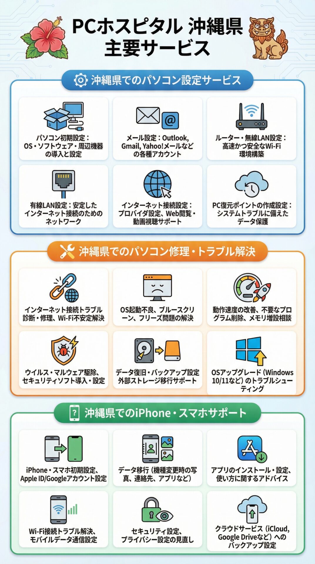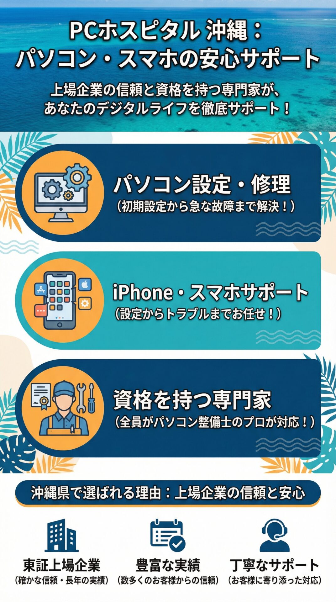 沖縄県にお住まいの皆さまへ:パソコン設定・修理・iPhone・スマホサポートはPCホスピタルで安心