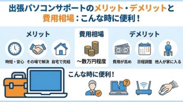パソコンのトラブルは、突然やってきます。「電源が入らない」「インターネットに繋がらない」「プリンターが動かない」など、困った時に「修理店に持ち込むべきか、それとも家に来てもらうべきか?」と迷う方も多いのではないでしょうか。 特に、デスクトップPCのように持ち運びが難しい場合や、複雑な設定が必要な場合は、自宅やオフィスに来てくれる出張パソコンサポートが有力な選択肢になります。 【基準日(確認時点)】…