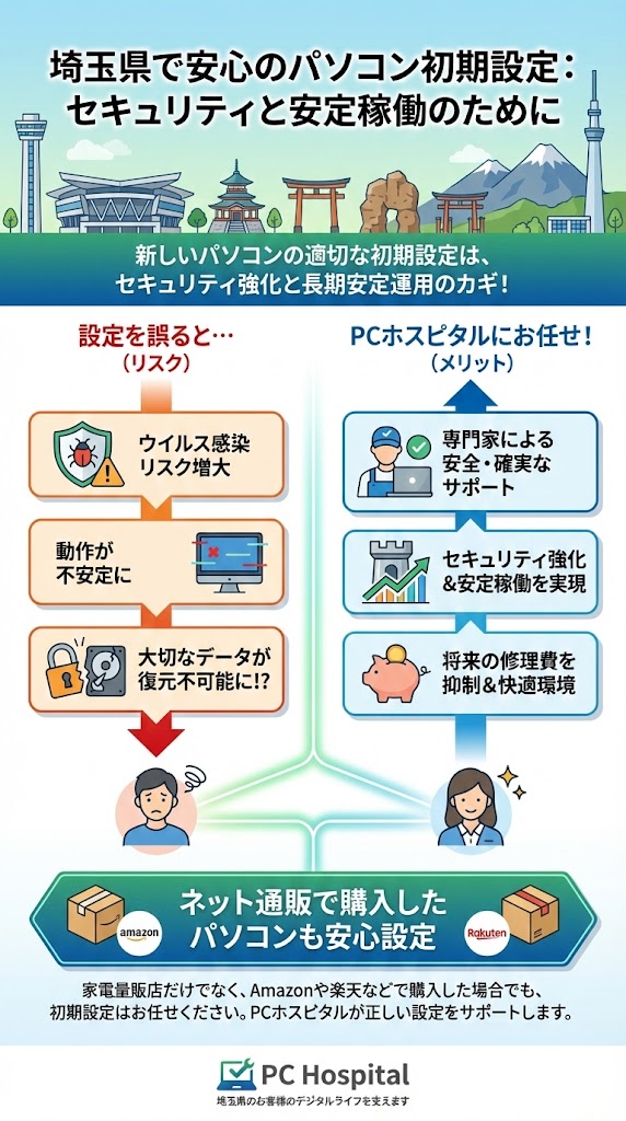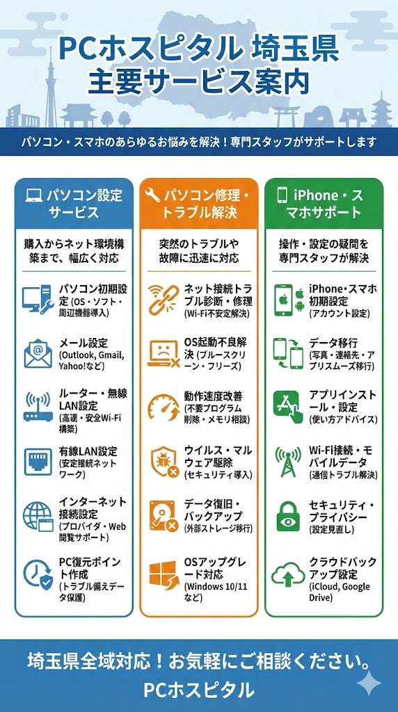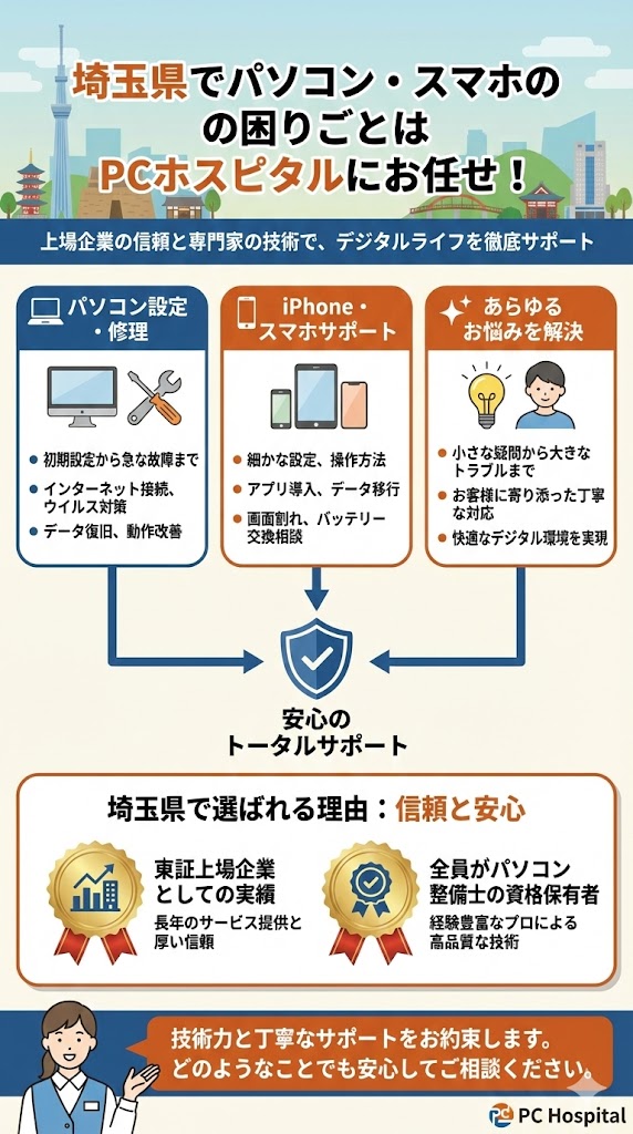 埼玉県にお住まいの皆さまへ:パソコン設定・修理・iPhone・スマホサポートはPCホスピタルで安心