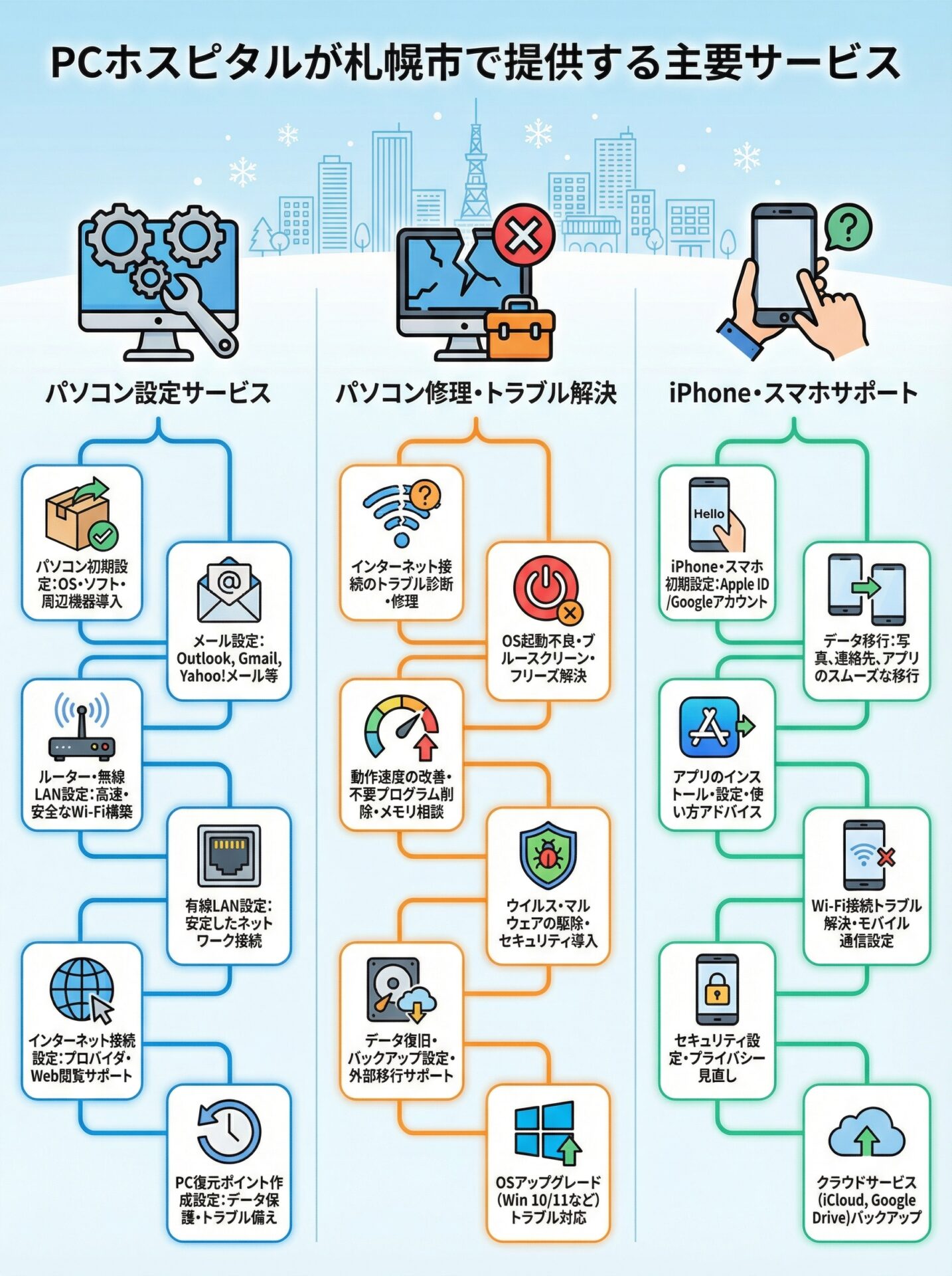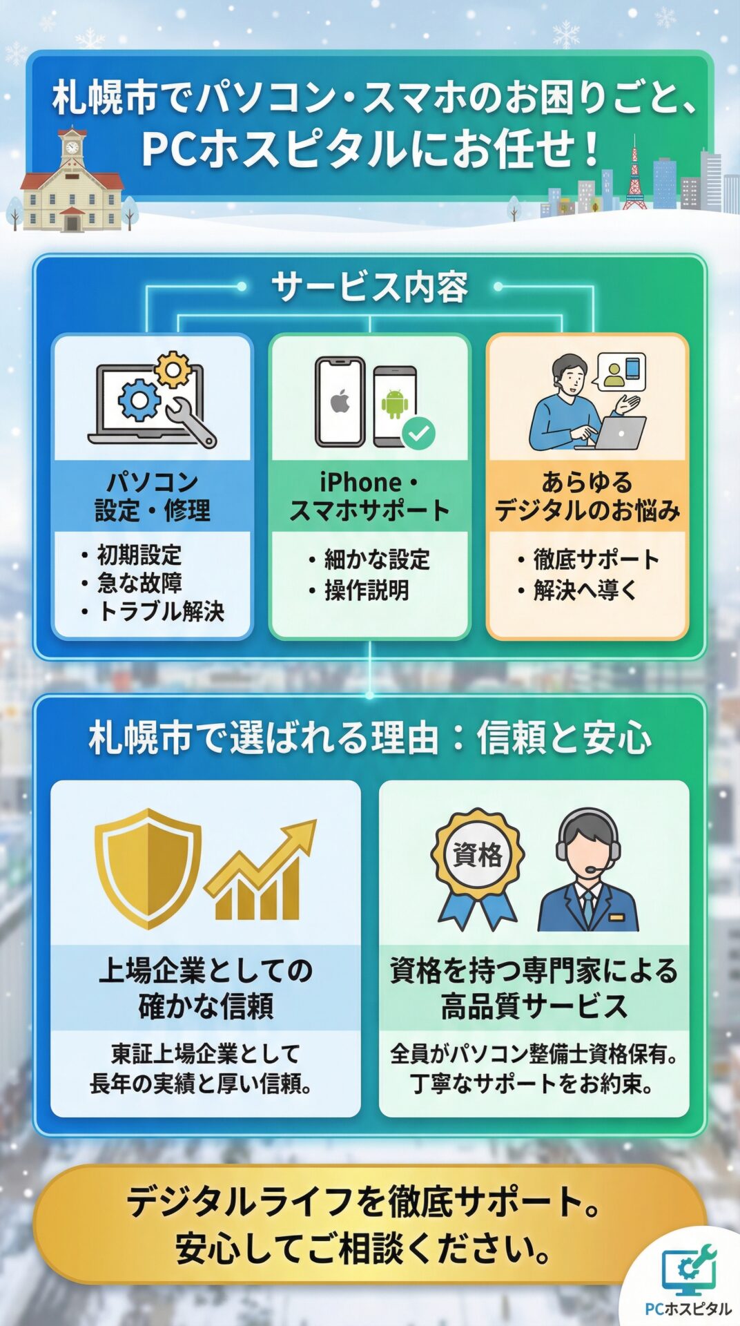 札幌市にお住まいの皆さまへ:パソコン設定・修理・iPhone・スマホサポートはPCホスピタルで安心
