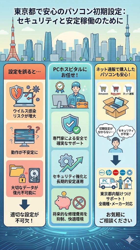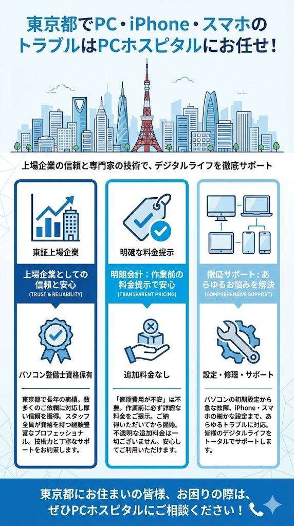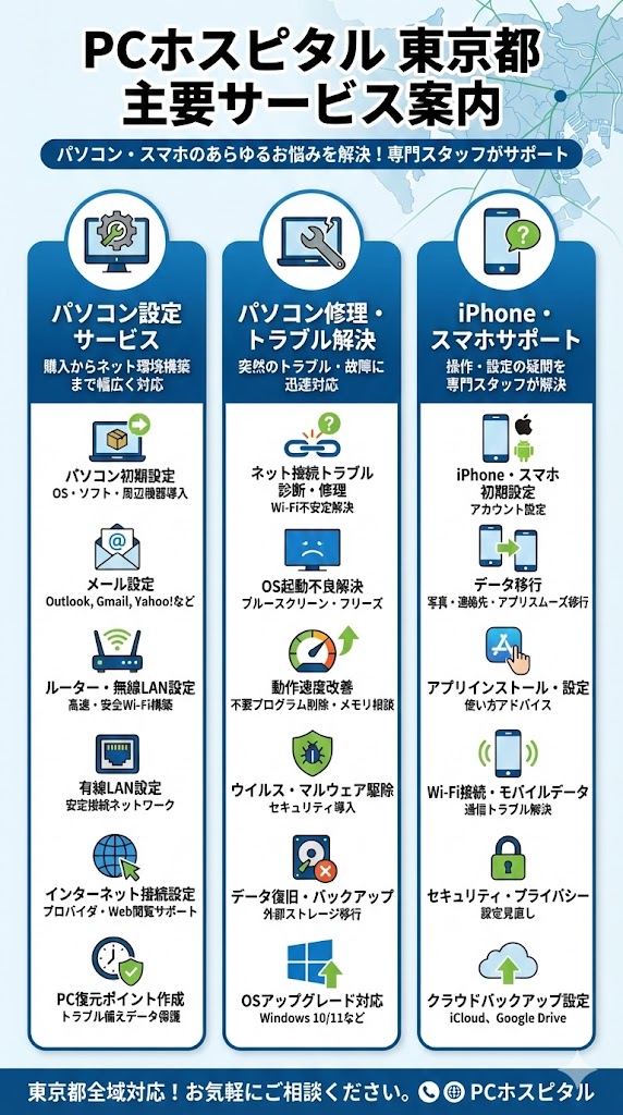 東京都にお住まいの皆さまへ:パソコン設定・修理・iPhone・スマホサポートはPCホスピタルで安心