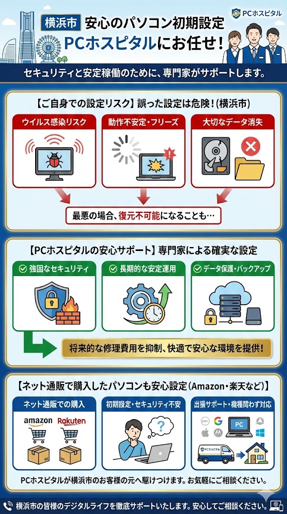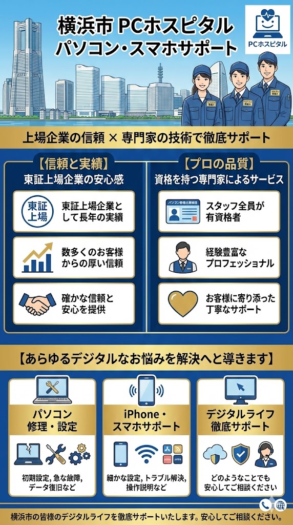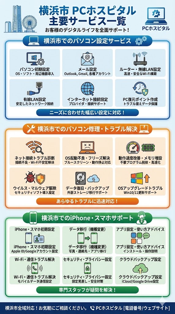 横浜市にお住まいの皆さまへ:パソコン設定・修理・iPhone・スマホサポートはPCホスピタルで安心